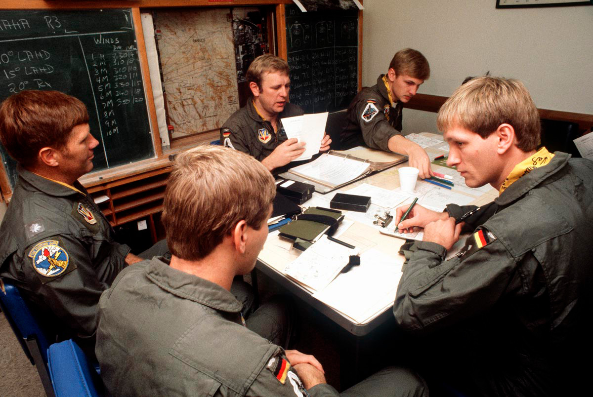 Nicht nur wir mussten unser Denglisch verbessern auch die Amerikaner wollten Deutsch von uns lernen. Und so kam es, das eines Tages nach Rückkehr ordentlich ins Bordbuch geschrieben wurde: Fuelpump / Leckage. Aber es wurde auch ein Zettel an den Flieger geklebt: …Kraftstoffpumpe im Eimer!!! Stunden sDie ca. 90 deutschen Starfighter flogen aus verwaltungstechnischen Gründen nicht mit dem Eisernen Kreuz, sondern mit US Hoheitsabzeichen. Auf dem deutschen Teil von Luke AFB werden die F-104 der 2. Deutschen Luftwaffen-Ausbildungsstaffel von ungefähr 450 amerikanischen Lockheed-Zivilangestellten betreut. Kurioserweise müssen die F-104 Ersatzteile mit C-160 D Transall-Transportmaschinen des Lufttransportkommandos aus Depots von Deutschland nach Luke AFB eingeflogen werden, weil die komplette Ersatzteillagerung in Deutschland ist.
